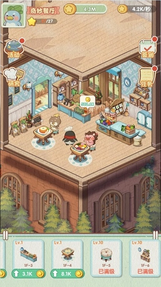 接下来玩家只需在下方菜单里挑选合适的装饰品,就能开启营业。随着金币不断积累,还能进一步升级装修设施,最高可以升到10级。