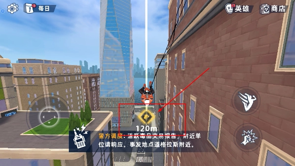 1、操控蜘蛛侠借助蛛丝在高楼之间穿梭移动,留意【120m】的标识以及警方的调度信息,按照提示移动到目标位置。