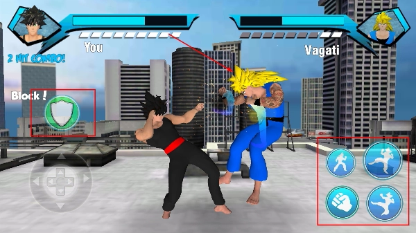 3、遇对手攻击点击【Block】按钮防御,右侧技能按钮释放不同招式搭配连招提升伤害。