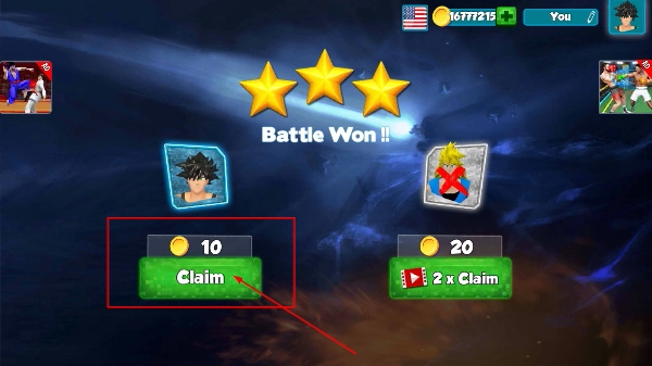 4、战斗胜利后点击【Claim】按钮领取金币奖励,积累资源解锁更多角色或提升战力。