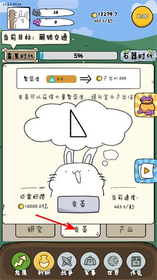 点击变革按钮,即可启动文明变革的进程。这一变革能显著增加金币等收益的产出,是文明迈向更高阶段的核心操作。完成变革后,文明将进入全新阶段,解锁更多发展可能。