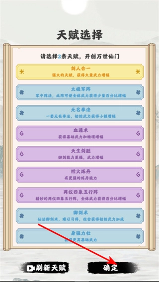 进入天赋选择界面后,挑选适配的修仙天赋“剑人合一太极真阵”,然后点击确定按钮即可完成选择。