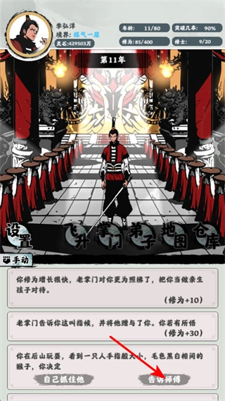 拥有15种不同天赋,涵盖资源获取(如“商界鬼才”增灵石、“控火炼丹”随机给丹药)、战力增幅(如“五感剥夺”“人剑合一”提升掌门武力)、修为提升。