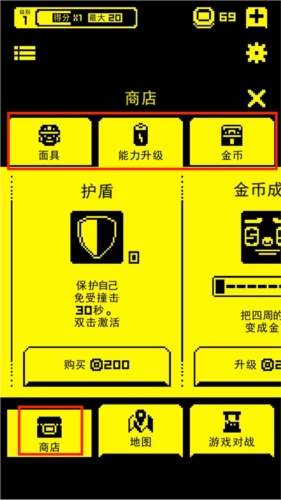 进入商店界面,包括面具、能力升级以及金币的购买,