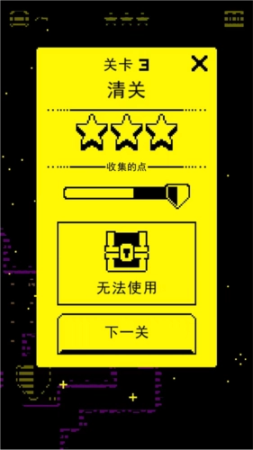 如图所示,三颗星星已全部收集完毕,并且成功抵达出口。完成当前关卡后,你可以点击【下一关】按钮,继续挑战新的关卡。