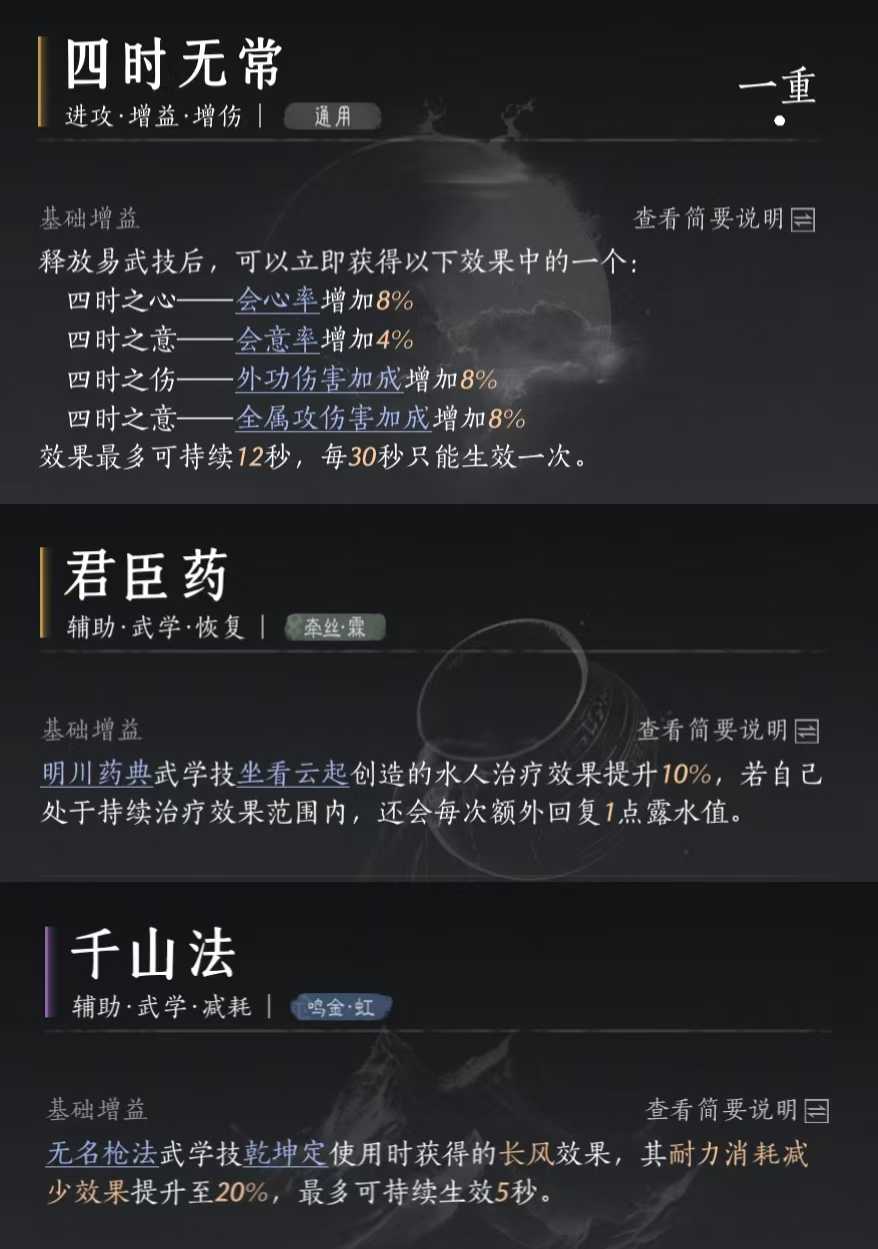 第四个心法可以在这三个心法中选择,一般是主推四时无常,但是很多小伙伴打起架来可能不习惯释放易武技导致吃不上buff,又或者是不够长鸣玉购买,那么我们就可以从白嫖的君臣药或者千山法中选择;