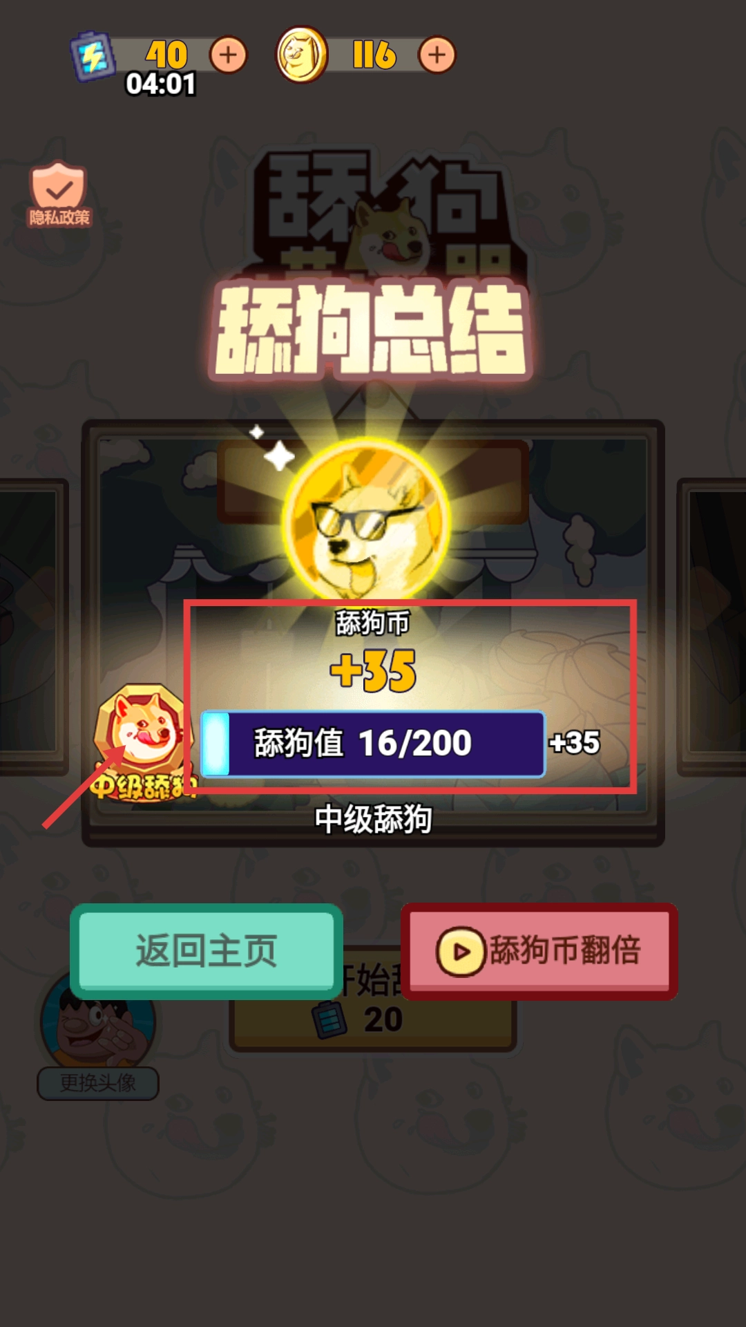 完成互动后点击查看【舔狗总结】,就能领取【舔狗币+35】的奖励,同时【舔狗值】会从-16/200更新升级,晋升为中级舔狗。之后你可以选择【返回主页】,也能继续进行游戏。