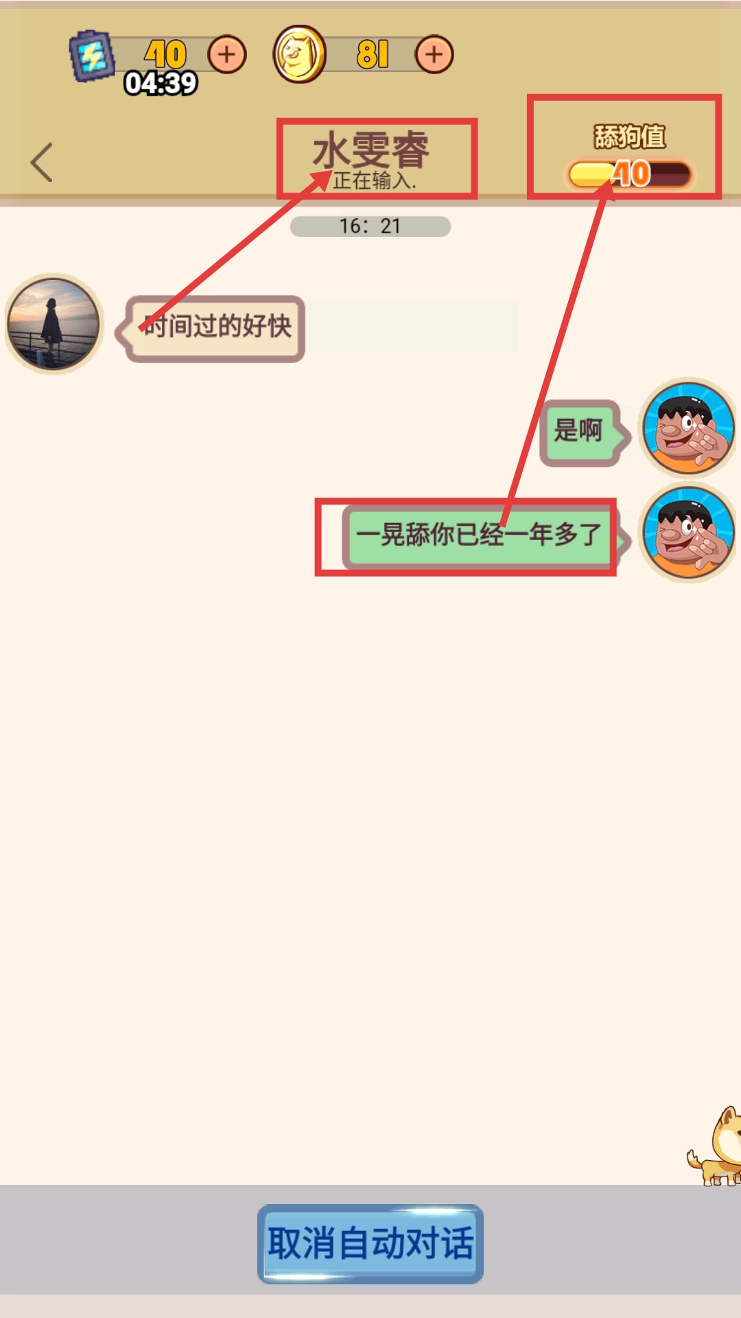 和水雯睿交谈时,挑选像【不知不觉间已经舔了你一年多啦】这样的选项,能持续增加【舔狗值-40】,要留意对话选项对这个数值产生的作用。