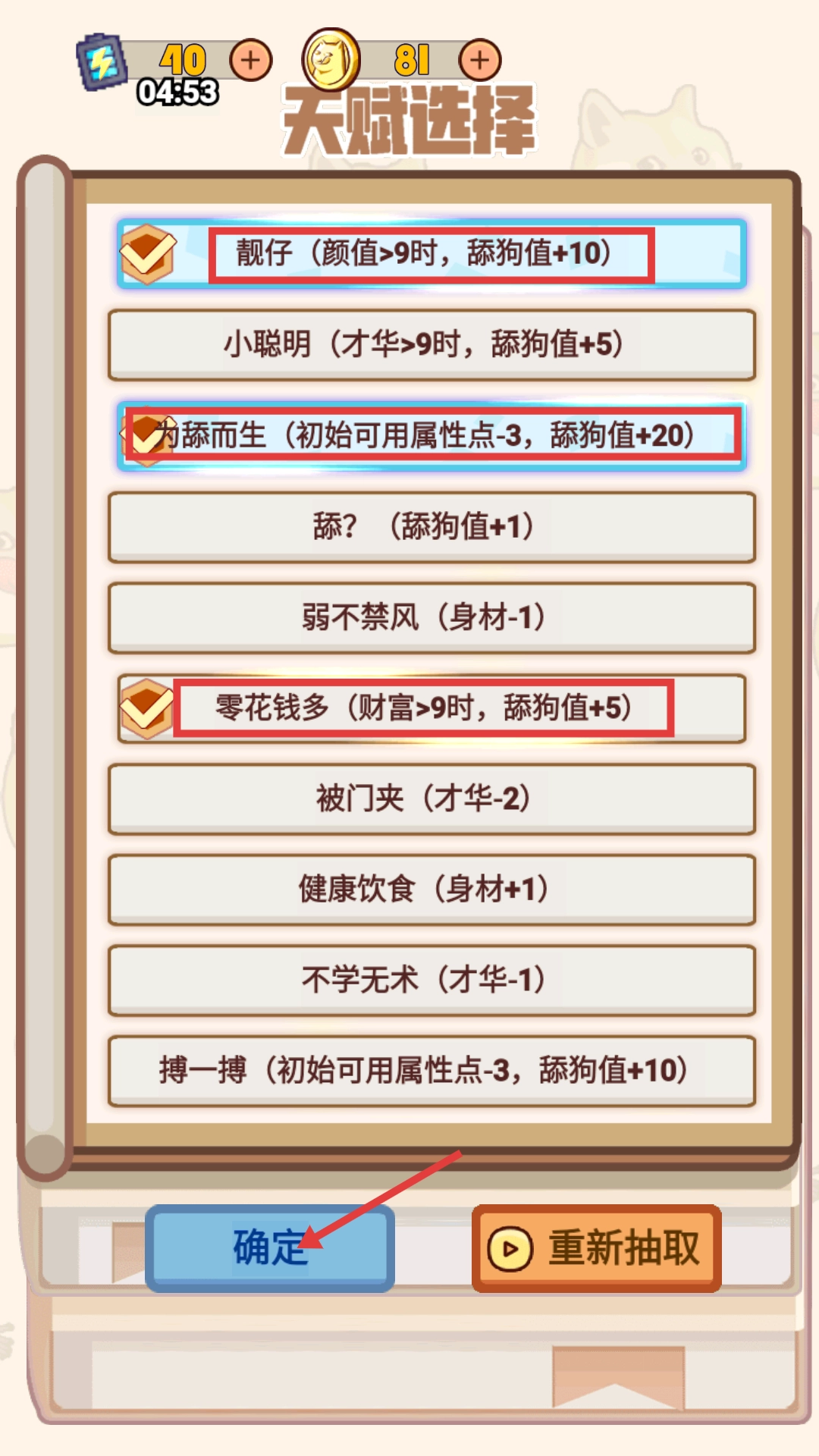 在【天赋选择】界面,选择【靓仔-颜值>9时-舔狗值+10】【零花钱多-财富>9时-舔狗值+5】这类天赋,选定后点击【确定】按钮让天赋生效。