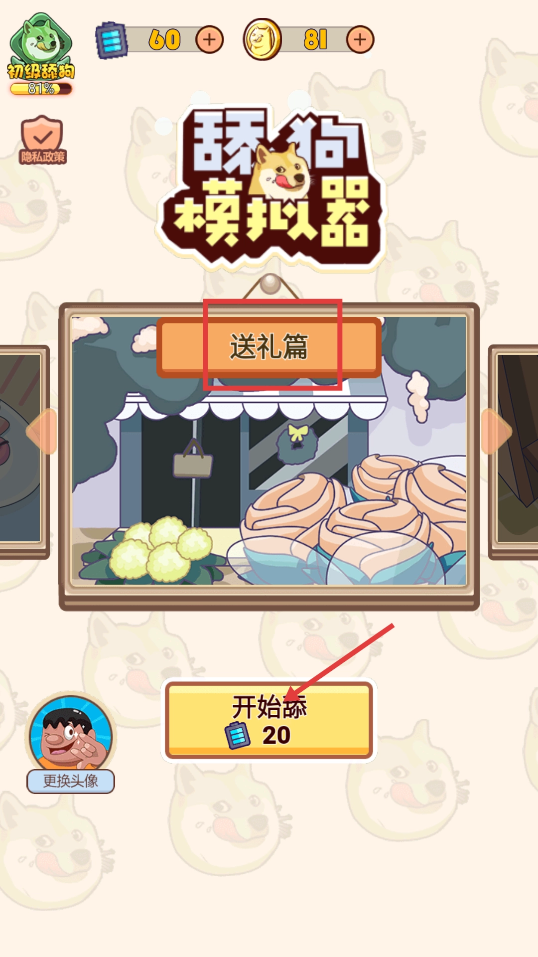 进入【送礼篇】界面后,点击【开始舔-20】按钮,通过消耗电量解锁送礼相关玩法,以此推动游戏进程。