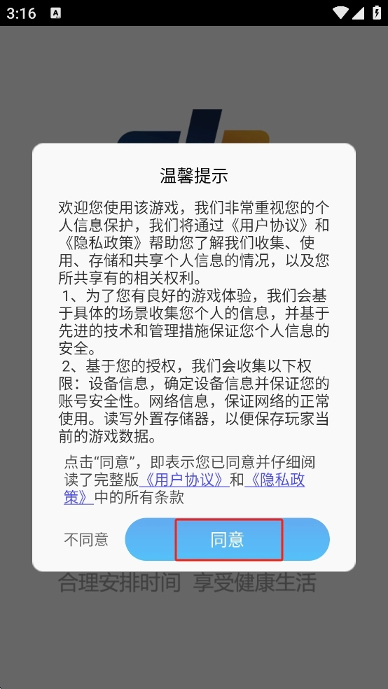 1、请您仔细阅读并同意隐私政策,点击“同意”按钮后就能进入游戏。
