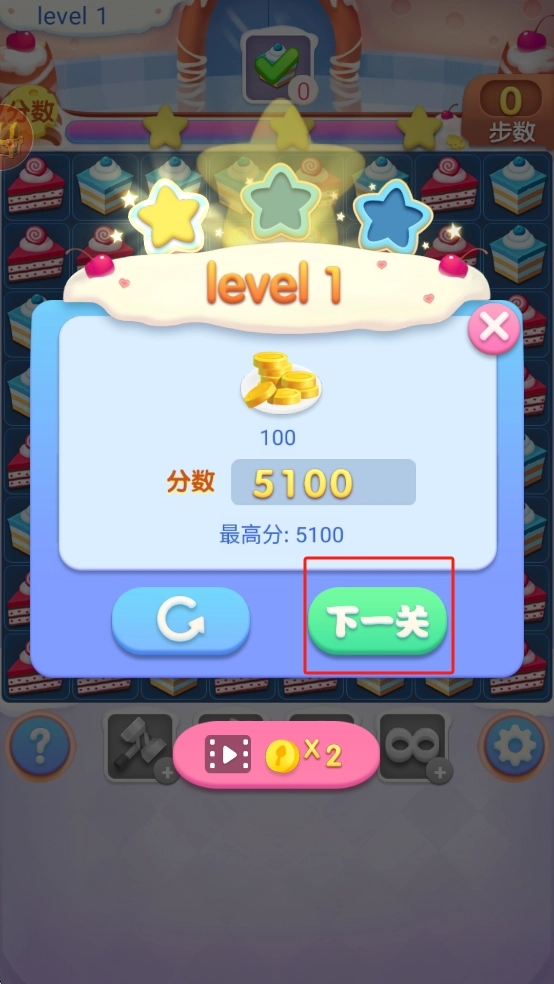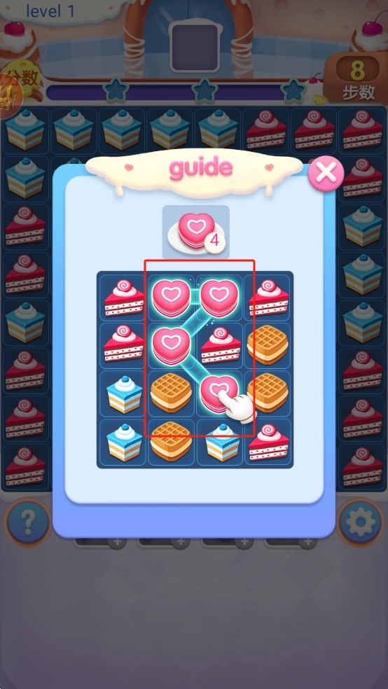 3、关卡目标设定:每关设有不同通关条件,有的需要收集指定甜品,有的要在步数内达到分数。