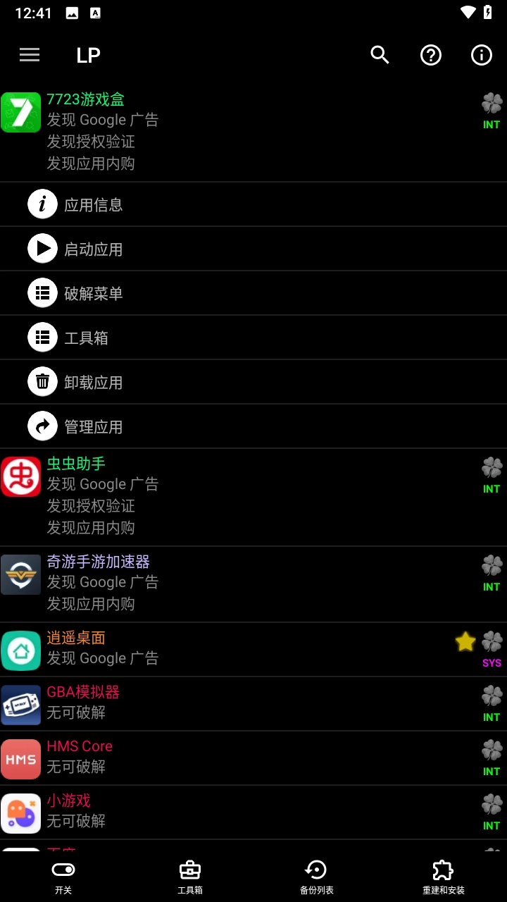 23、支持按授权验证、谷歌广告、自定义等条件筛选应用列表,精准查找目标。