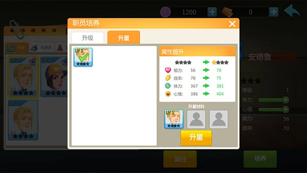6、使用相同的员工材料能够为员工提升星级,员工升星之后,其能力、效率、体力以及心情等各方面都能得到全面的提升。