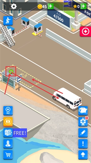 巴士到达后,点击【公交站】的交互标识来完成新兵接引流程。此时人口会显示为【人口-4/500】,资源也会同步更新,要持续留意设施的状态变化。