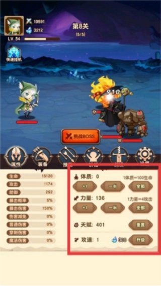 在游戏战斗界面,顺着箭头所指的方向点击【挑战BOSS】按钮,即可开启第8关的BOSS战斗。
