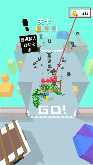 当角色靠近【红色敌人】群体时,会自动发起攻击,通过集中火力消灭敌人能够推动关卡进度。