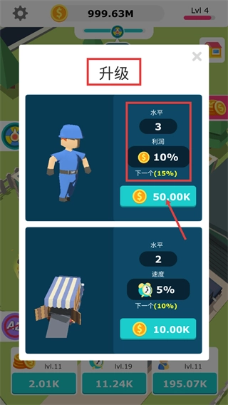 1.团队升级:在【升级】界面中,消耗【50.00K】金币为工人进行升级操作,这一行为能够提升【利润-10%】等关键属性,从而切实提高资源获取的效率。