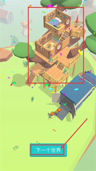 4.开拓新篇:当某个场景的建筑建造完毕后,点击【下一个世界】按钮,就能前往全新场景继续拓展事业版图,开辟更多资源获取途径。