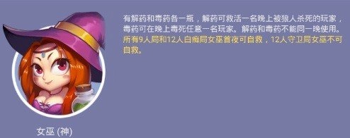 技能:每晚能够查验一名玩家的身份,查验得到的结果会显示为“好人”或者“狼”,不过无法得知该玩家的具体角色。4、女巫(神)