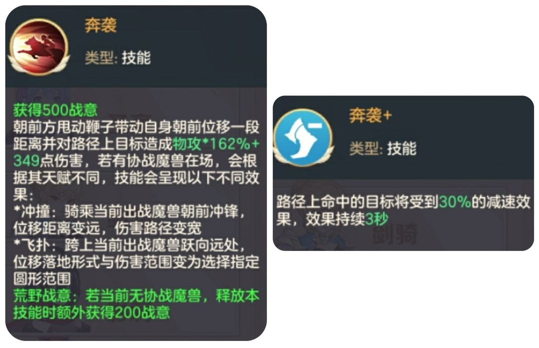 奔袭:使用获得500战意,若无协战魔兽,还能额外获得200战意共700战意,是驯兽师唯一位移技能,也是给大招刷战意的关键技能,命中附带减速效果。实战中开局奔袭空放+普攻A几下大招就蓄势待发了。夸张一点来说奔袭的技能cd有几秒,驯兽师的大招就是几秒cd,在实战上这么说一点也不过分。