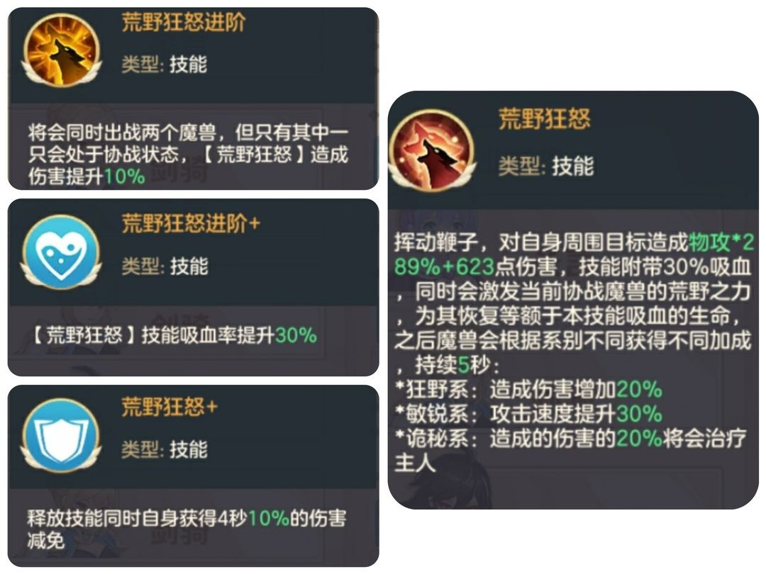 荒野狂怒:驯兽师分支万兽王核心技能,核心技能是职业玩法定位的关键指标,我们可以看到荒野狂怒的被动主要是提升技能吸血率和提升伤害减免百分比,主要是偏向于续航方面。