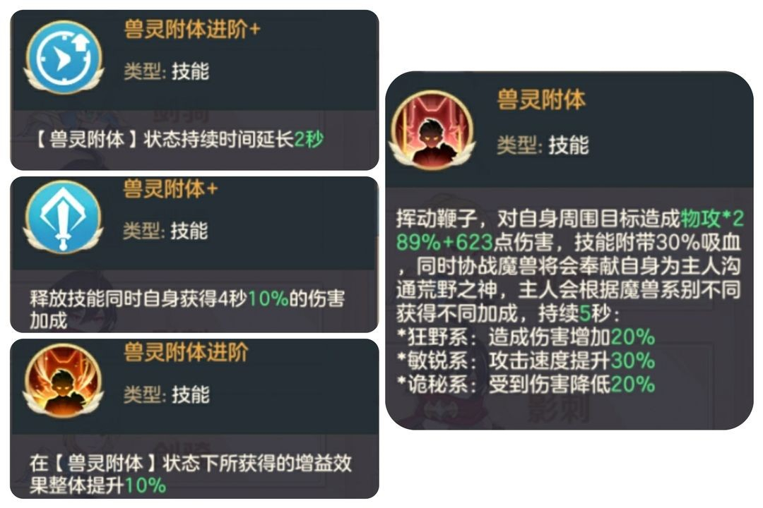 兽灵附体:驯兽师分支通灵王核心技能,核心技能是反馈职业玩法定位的关键指标,我们可以看到兽灵附体技能被动主要是提升附体时间,提升自身伤害加成和附体状态下所有增益效果加成。