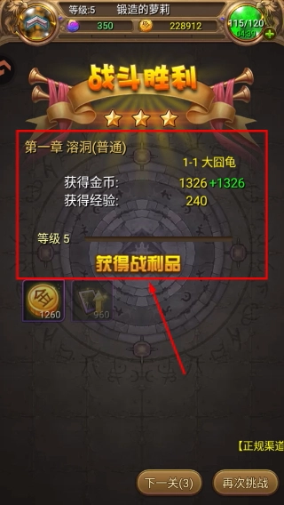 4、完成【第一章溶洞(普通)-1-1大回龟】关卡后,能够得到【1326】金币、【240】经验以及相关道具,这些奖励有助于角色提升等级。
