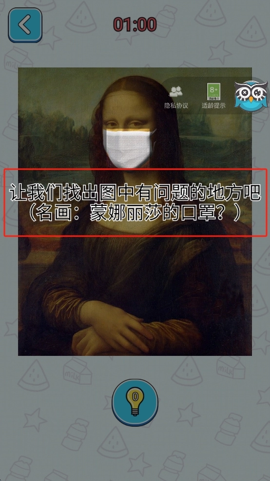 3、接下来,仔细观察图片,从中找出那些不合常理的地方,像“蒙娜丽莎戴口罩”这类情况就属于奇怪之处。