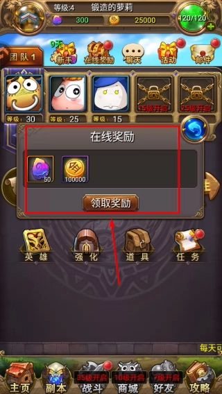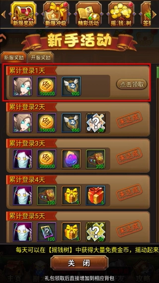 3、在新手活动中领取累计登录1天奖励,获取【金币】-【10000】与【英雄碎片】-【50】,快速提升队伍基础战力。