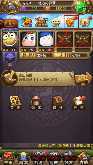 2、点击【活动】参与任务,也可先完成【逃出包围圈】通关普通1-1大围龟,点击【前往】推进关卡进度。