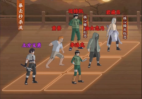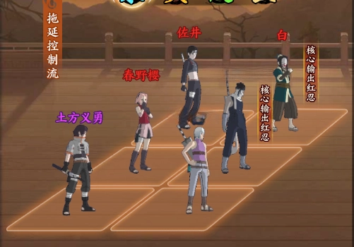 五号位:重吾负责补充输出,在确保自身生存的前提下削减敌方查克拉,以此限制敌方的行动效果。