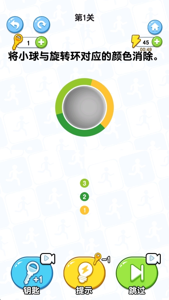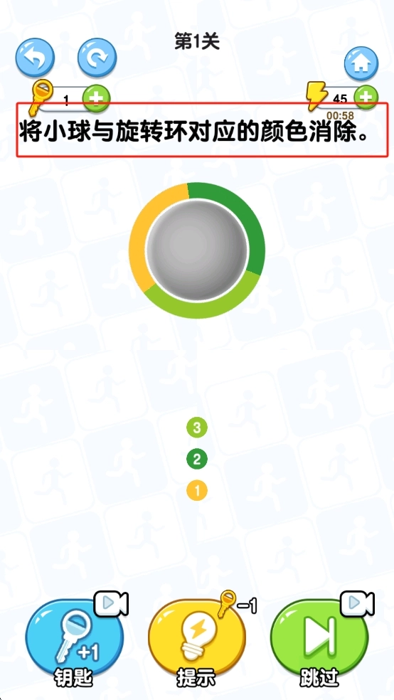 3、按照提示把小球和旋转环对应的颜色进行消除,以此达成关卡目标。