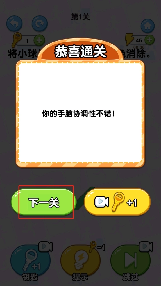 4、通过关卡后,点击“下一关”按钮,继续游戏。