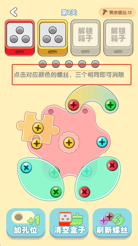 3、点击对应颜色的螺丝,三个相同即可消除。