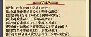 天赋上看,加攻击和暴击、伤害的比较多,对魏国的伤害提高30%很赞,和黄忠组合起来更是机智的选择。