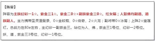 2、95级的子牙、太子、玉帝、红唐僧、红女娲,主角转为红唐僧。1☆貔貅、0☆火龙、0☆宝莲灯、0☆紫金元神、元始天书。具体站位参照下图。