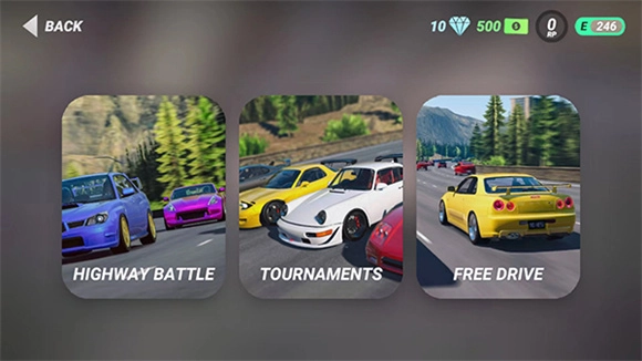 游戏包含【highway battle】公路战、【tournaments】锦标赛与【freedrive】自由驾驶三种模式,玩家能自主选择体验,以下就以公路战模式为例展开说明。