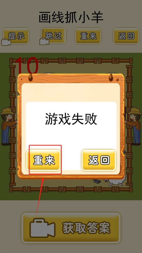 4、游戏失败后可选择“重来”或“获取答案”。