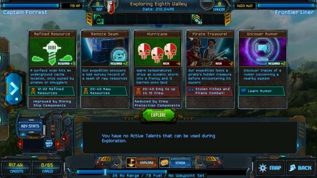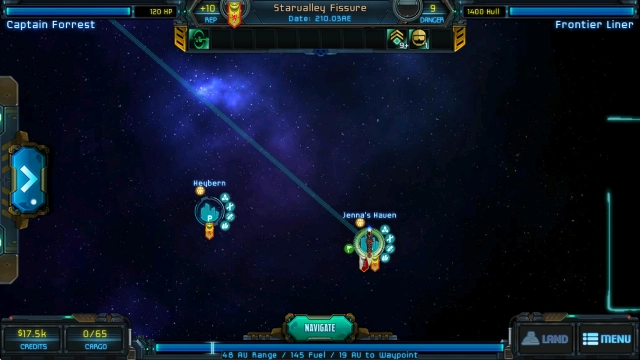 ,一款以星际探索为主题的科幻冒险类。我们将会进入到浩瀚的宇宙当中,驾驶自己的宇宙飞船探索广袤的银河,来到各个星球当中采集资源,通过贸易的方式来赚取源源不断的收入。另外,在冒险的途中,我们也会遭遇到宇宙海盗和外星人的威胁,需要组织船员们拿起武器进行反击,并一步步的升级船只、船员,让你能够征服整个银河系!