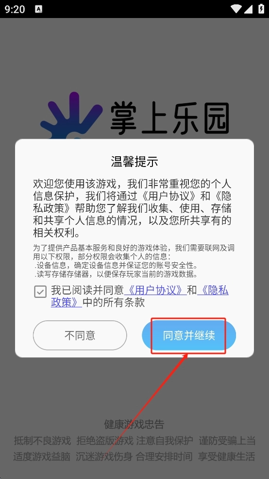 1、点击“同意并继续”按钮,以此接受用户协议与隐私政策。