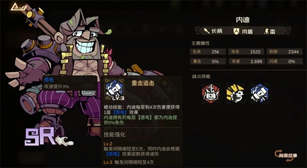 其他内容之前都聊过了,这里重点说说内迪。他在雷属性角色里算是挺不错的肉盾,二技能自带嘲讽效果还能回血,最关键的是被动带来的免伤——当叠满10层感电buff时,能获得50%的免伤,而电系队伍里感电buff很容易就能叠到10层,作为前排角色,能常驻50%免伤的强度相当高。不过内迪有个明显的短板:他的被动免伤效果需要三星才能解锁,所以低星阶段暂时用不上他。
