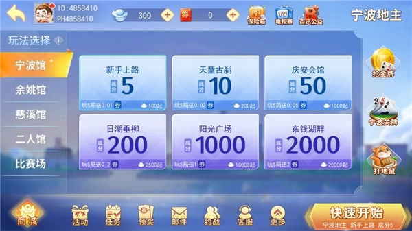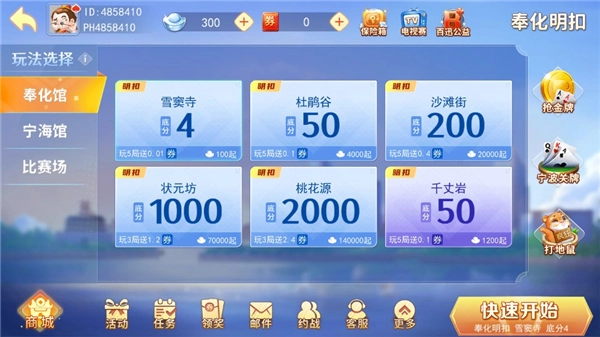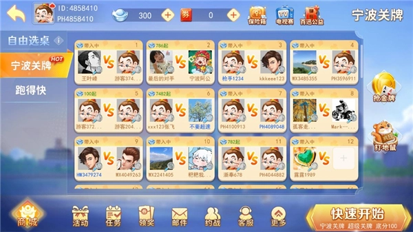 宁波游戏大厅最新版本是专门为宁波及其周边地区打造的本地特色棋牌游戏应用,收录了多样的本地经典游戏,像宁波麻将、奉化双扣、象山拖拉机、宁海打纵、北仑无搭麻将等特色玩法都包含在内,此外还提供了在全国范围内深受欢迎的中国象棋、斗牛等传统游戏。