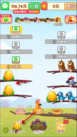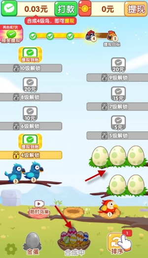 只要合成出更高等级的小鸟就能拿到红包奖励,合成得越多,奖励就越丰厚,最后能提现的收益也就越大!