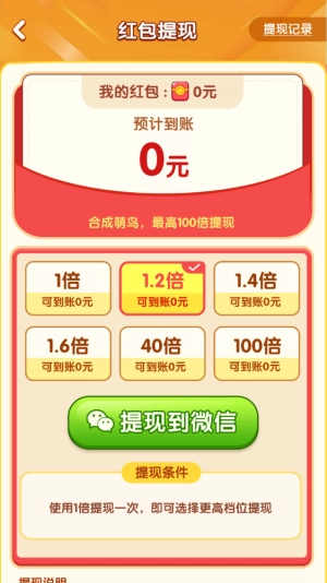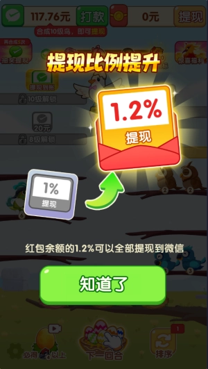 除了关卡提现外,积累的红包也能按比例提现,而提现比例可以通过合成高等级小鸟来提高。