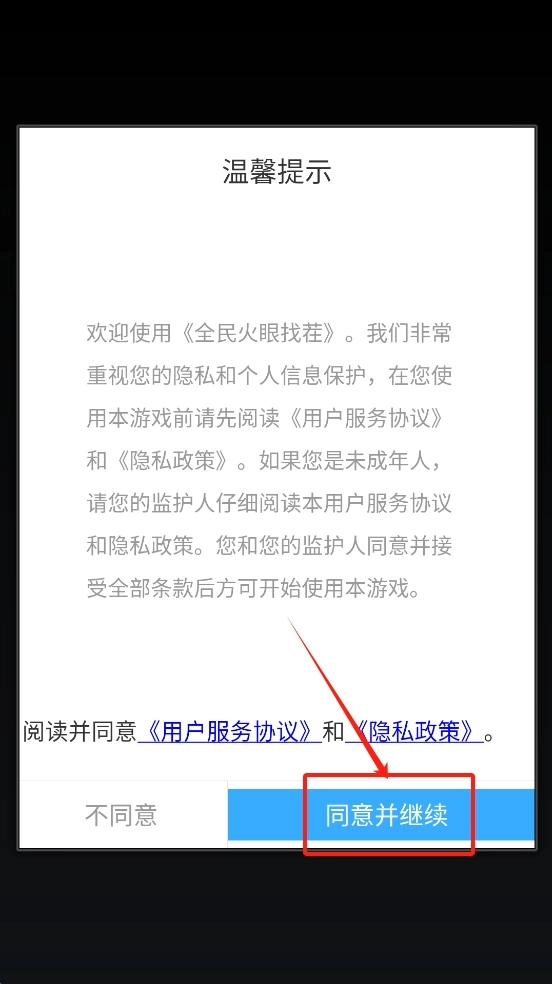 1、第一步,请点击“同意并继续”按钮,同时阅读并同意《用户服务协议》与《隐私政策》。
