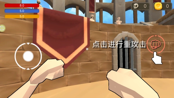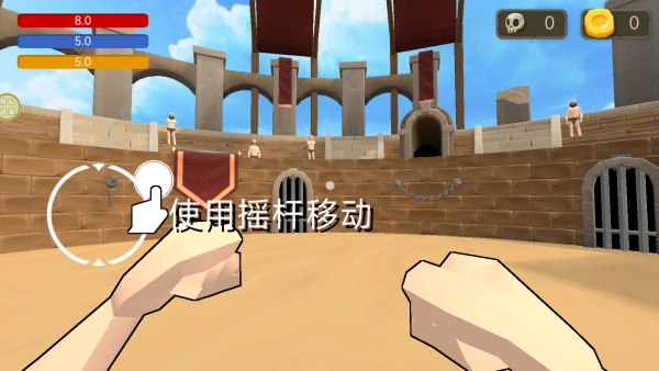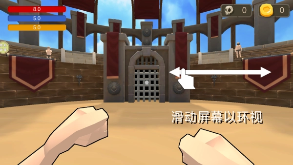 1、点击开始游戏,滑动屏幕调整视角环顾四周,熟悉角斗场的环境以及敌人的分布状况。