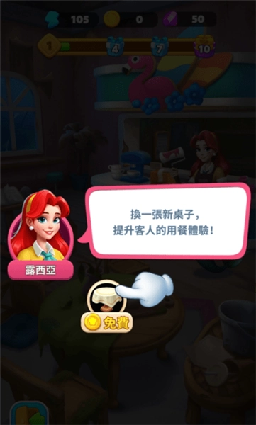 2.接着选择升级一张新桌子,在此处可以点击免费升级选项,以此来提升顾客的用餐体验;