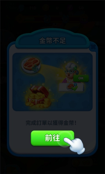 4.点击后会弹出金币不足的提示,需完成订单赚取金币以进行升级,此时点击“前往”选项即可。