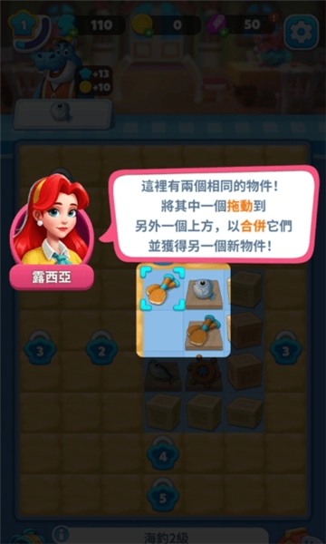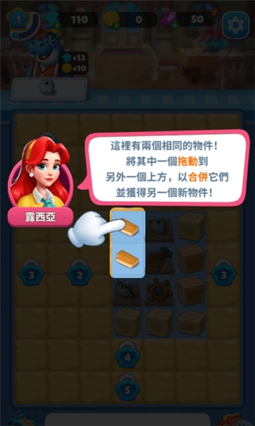 5.接着进入订单闯关界面,在该界面中能够对两个相同的物件执行拖动操作,把其中一个物品拖动到另一个物品的上部,完成这一操作后就能获取一个新的物件。